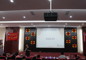 紧接着在主持人的宣布下本次评比活动正式开始,经过初赛,十一位选手脱颖而出,走上了决赛的舞台。在舞台上,他们给学弟学妹们描述了他们大学四年的学习生活,社会实践及他们的实训结果,让学弟学妹们的内心充满斗志以及对未来的期待。 期间,由学生会出演的《渔舟唱晚》让各位选手和观众心情舒畅,增加了活动的气氛。评选中,金明辉副书记、江奇峰主任、徐娟老师分别对十一位选手进行细致的点评,指出他们上台演讲时的一些小瑕疵并希望能及时改正。其次,寄语各位毕业生踏入社会时要牢记校训,好好努力工作,回报社会,回馈母校。
