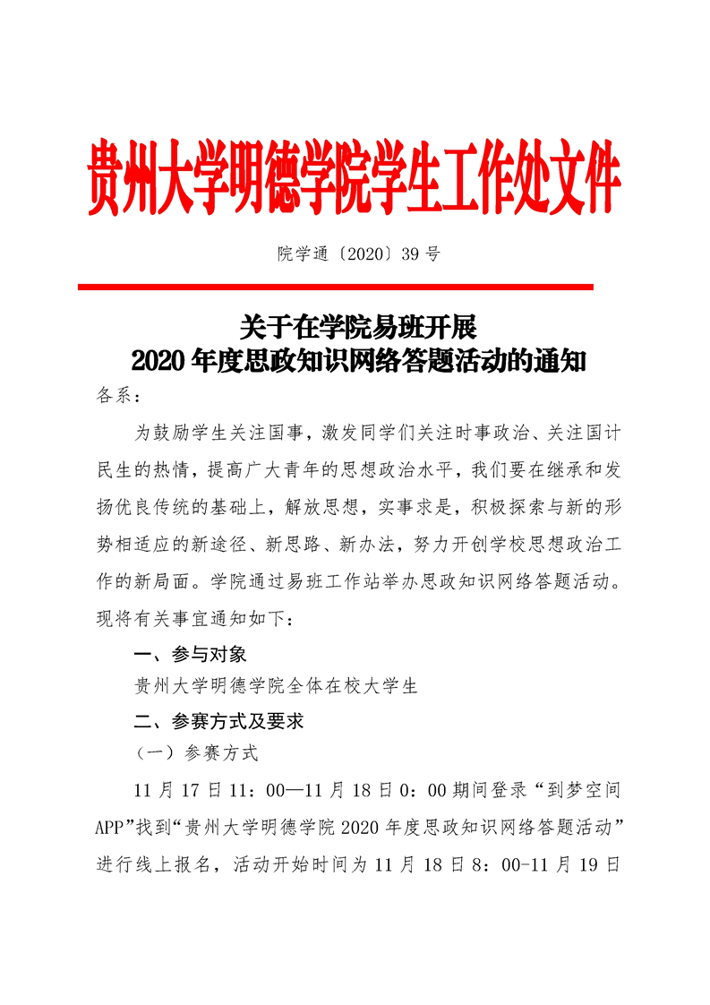 关于在学院易班开展2020年度思政知识网络答题活动的通知