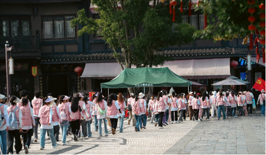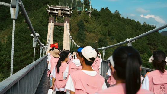 午餐过后,青年们来到万达小镇进行走访参观,蜡染、造纸、苗族服饰映入眼帘,侗族大歌声声悦耳、长桌宴摆满了小镇。穿过娜悠桥,感受着大自然带来的馈赠,同学们纷纷欣喜不经感叹:丹寨,你好!
