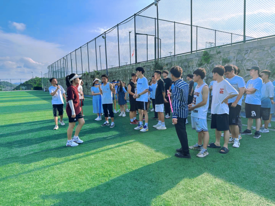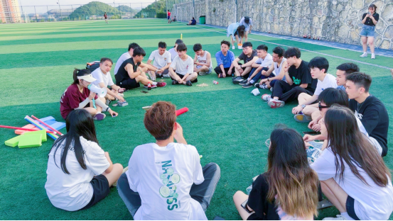 本次活动全班分为5个队伍,全程共6个活动环节,前5个环节为团队游戏,最后一个换节是合唱联谊。活动全程由班长罗晟睿、张艺娴担任主持,综合获胜次数最多的前三支队伍奖励“柿柿如意”陶瓷杯礼盒一份。第一个环节是游戏《不倒森林》,参与挑战的学员围成一个圆圈,每人拿一根彩色塑料管,让棒直立后用右手掌心按住棒的上面,左手放在背后,保持棒直立,在喊“换”时,后一人接住前一人的棒,过程中培养了同学们做事的专注能力。第二个环节游戏为《摸石头过河》,每队派四名选手参赛,每人三块河石,身体的任何部位不得直接触碰除河石之外的支撑物,用时最短获胜。第三个环节游戏为《两人三足》每队两两同学一组,两人并排站立,脚踝以上部分栓绑腿带,协调走至对面标志处折回,再将绳子解下交给下一组队员,用时最短完成的队伍取胜。第四个环节游戏为《百科知识竞答》,由主持人读题,选手作答,卡片正面为题,背面为答案。每队答十题,答对数量最多队伍获胜。第五个环节游戏为《环游世界》,团队成员手拉世界球地图边缘,通过全队配合协作使在世界球按照一定规则路线,从起点到达终点,网球行进过程中不允许掉落,用时最短队伍获胜。