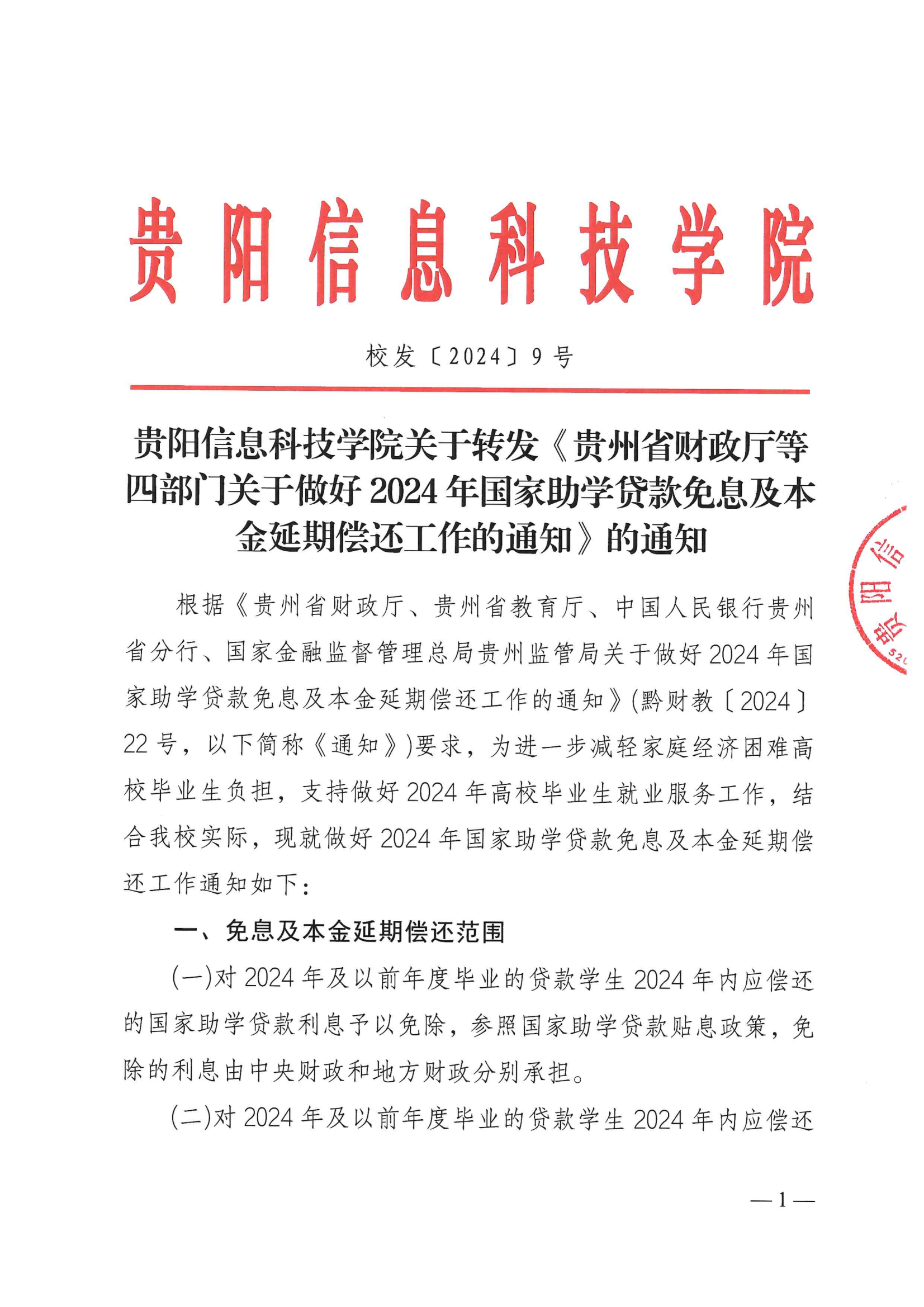 校发〔2024〕9号-pp电子官方网站关于转发《贵州省财政厅等四部门关于做好2024年国家助学贷款免息及本金延期偿还工作的通知》的通知