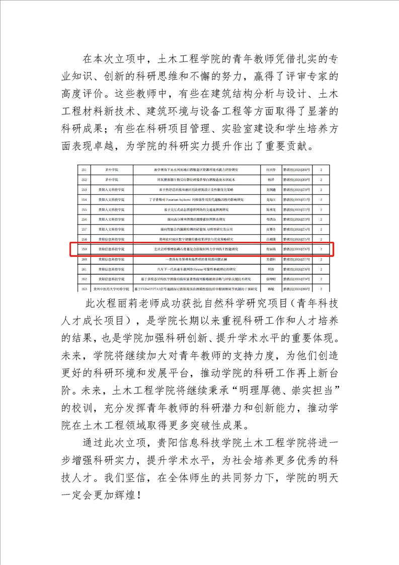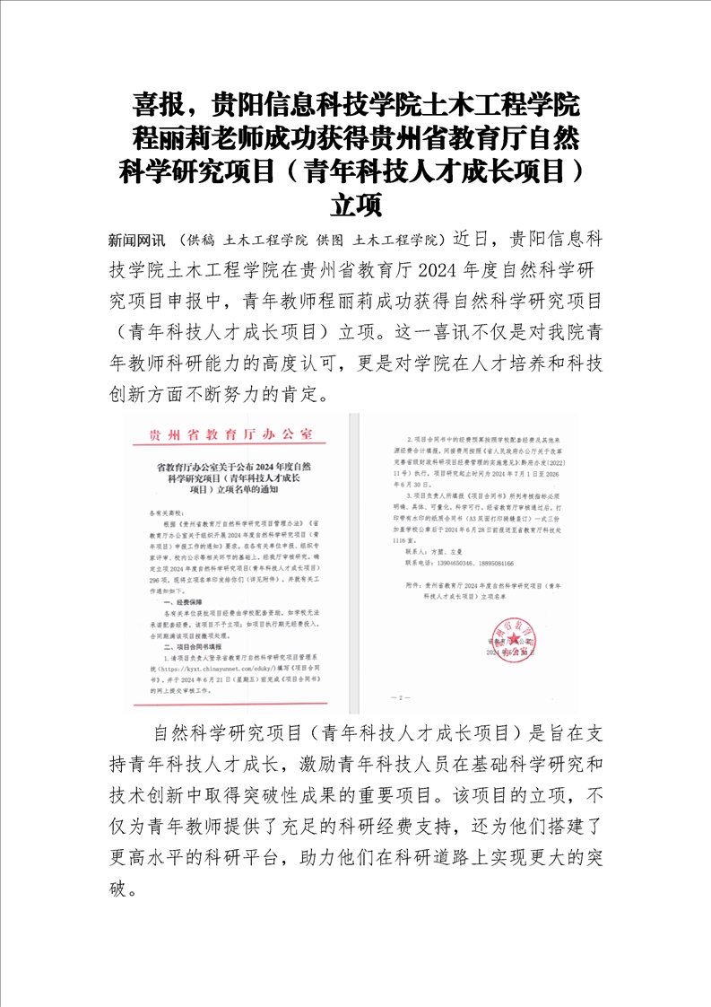 喜报,pp电子官方网站土木工程学院程丽莉老师成功获得贵州省教育厅自然科学研究项目(青年科技人才成长项目)立项