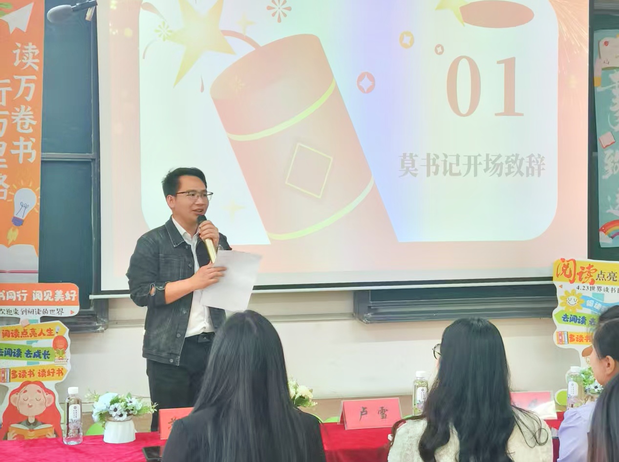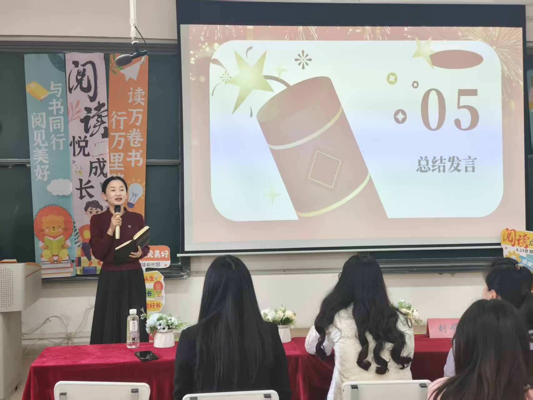 学校图书馆办公室副主任何正直老师作总结讲话。他先是对此次活动的成效给予了充分肯定,以饱含期许的话语分享了自己的深刻感悟:“一直以来,我始终认为阅读是一场孤独却意义非凡的精神跋涉。在今天的活动中,我欣喜地看到,校园的角落里处处可见同学们专注阅读的身影,无数年轻的心灵正沿着知识的长河奋力前行。这些闪耀着求知光芒的瞬间,不仅印证了阅读的强大生命力,更让我看到了当代青年对知识的执着追求与不懈探索。”并寄语全体同学:“希望大家能将这份对学习和阅读的热爱转化为持续的行动,让阅读成为滋养心灵的日常习惯。更期待你们能以自身为火种,将这份求知的热忱传递给身边的每一个人,让坚持的力量在校园中薪火相传,共同书写属于我们的知识华章。”