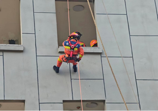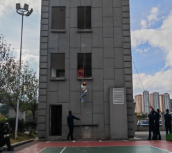 图为花溪区消防大队消防员模拟绳索攀爬
