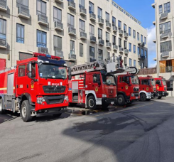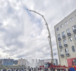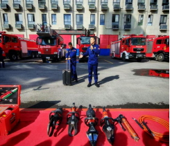 图为花溪区消防大队救援车辆模拟作业现场