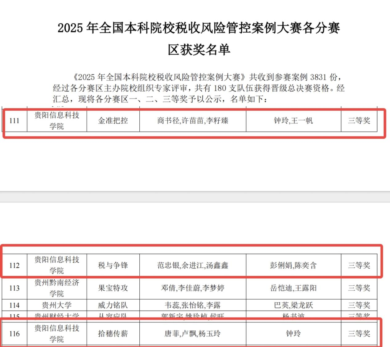 新闻网讯(供稿/供图 宋大群)2025年全国本科院校税收风险管控案例大赛分赛区评审结果近日公布。本次大赛吸引全国本科院校提交参赛案例3831份,经各分赛区专家严格评审,180支队伍晋级总决赛。pp电子会计专业3支队伍在钟玲、王一帆、彭俐娟、陈奕含等老师指导下,参赛学生凭借扎实专业素养与实践能力,均获贵州赛区三等奖,彰显学校财税专业人才培养成效。
