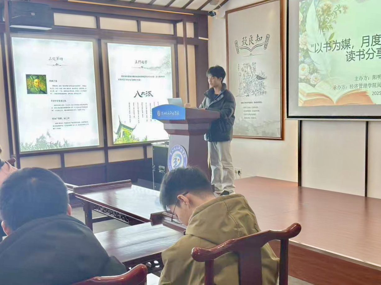 活动现场布置典雅,木质桌案旁师生围坐,营造出浓厚的书香氛围。在王阳明“心即理”的题字映衬下,七位来自不同年级和专业的同学依次登台,分享他们的阅读感悟。会计2302班刘硕、令狐彦晞与会计2501班魏韵瞩三位同学分别从不同角度解读《西游记》,剖析其中的团队智慧与人生哲理,赋予经典新的时代内涵;会计2301班郭雪风分享《我与地坛》,以真挚的语言传递出对生命的深刻思考与人文关怀,引发全场共鸣;余诗雅同学带来《平凡的世界》,讲述普通人在时代变迁中的奋斗历程,彰显向上向善的精神力量;大数据2403班蔡厚杰解析《围城》中的幽默笔触与人生困境,引发对现实生活的多重反思;会计2302班李彦楷则带领大家重温《三国演义》中的谋略智慧与英雄气概。每一段分享都真诚动人,每一次交流都激荡思维,现场氛围热烈而温馨。