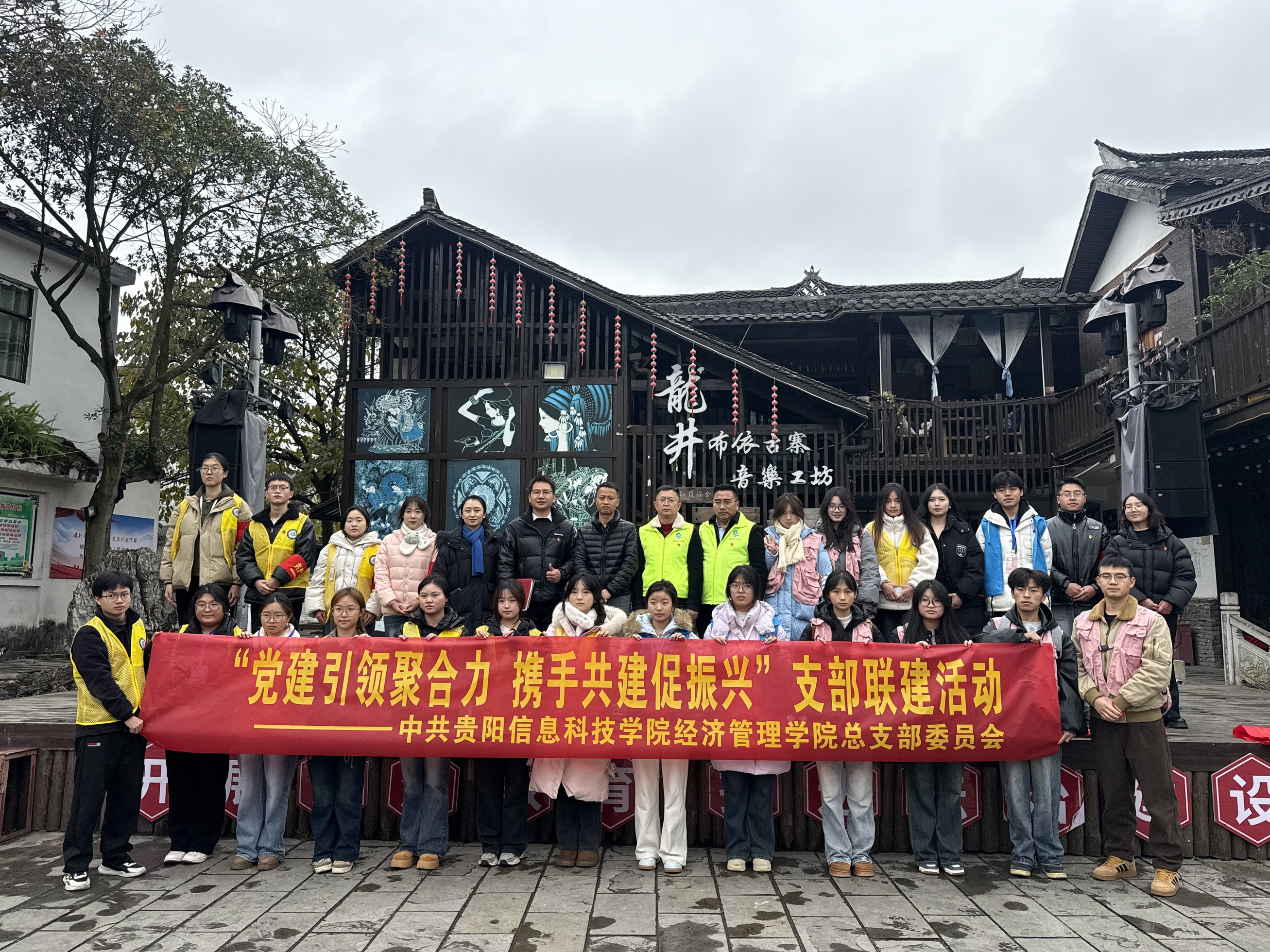 新闻网讯(供稿/供稿 经济管理学院)为深化校村合作、推动乡村振兴战略落地见效,经济管理学院党总支与龙井村党支部于2025年12月4日联合开展以“党建引领聚合力·携手共建促振兴”为主题的支部联建活动。活动通过理论联学、实践基地挂牌、文化墙绘、志愿服务等多元形式,探索高校与乡村基层党组织协同发展的新路径。龙井村驻村书记、支部书记、经济管理学院党总支书记莫建活、教师代表颜欣、李飞及30余名学生党团员代表共同参与此次活动。