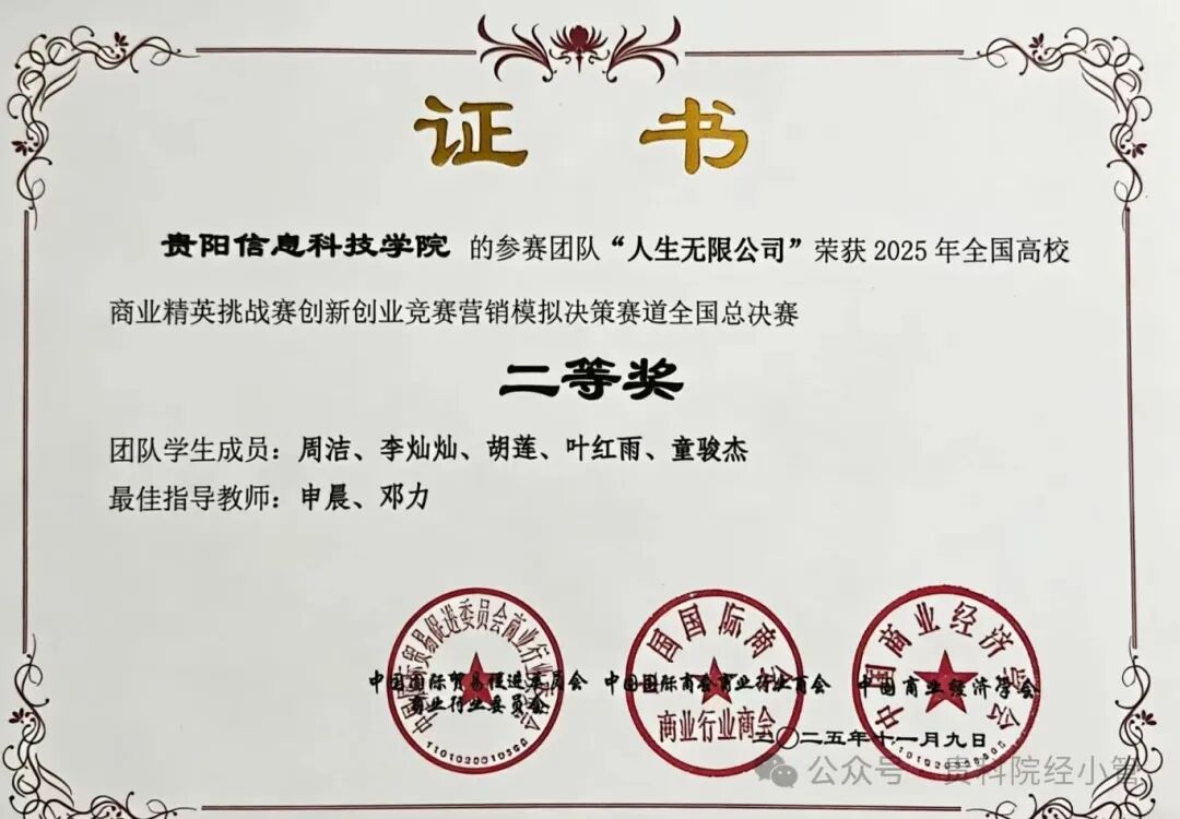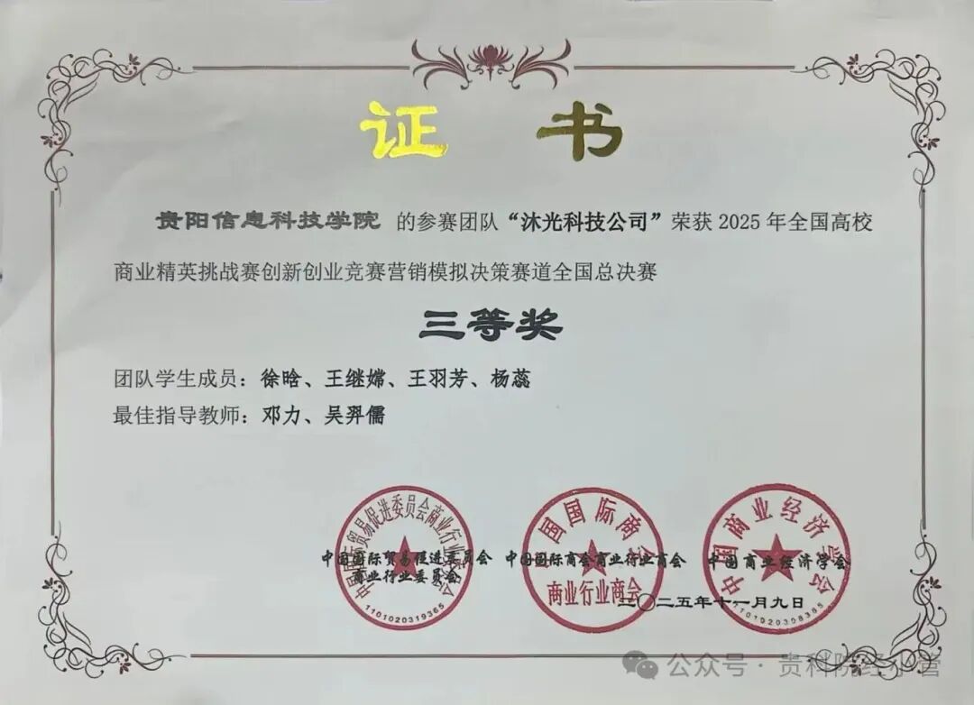 新闻网讯(供稿 宋大群 供图 吴羿儒)2025年11 月 9日,全国高校商业精英挑战赛创新创业竞赛营销模拟决赛赛道全国总决赛圆满落幕。pp电子三支参赛队伍在吴羿儒、邓力、申晨三位老师的悉心指导下,一举斩获多项国家荣誉。其中李彤团队(李彤、郭佳麟、翁考、简成孝)成功斩获全国一等奖,周洁团队(周洁、李灿灿、叶红雨、胡莲、童骏杰)成功斩获全国二等奖,徐晗团队(徐晗、王继嫦、王羽芳、杨蕊)成功斩获全国三等奖,三支队伍不负众望,为学校赢得了殊荣,彰显了pp电子学子的创新创业风采!