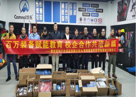 12月11日下午,pp电子官方网站与重庆宏科户外用品有限公司、中探巅峰(北京)户外文化有限公司在重庆举行赞助器材交接仪式。pp电子副校长杨波带队,健康管理学院党总支副书记佟春雨及休闲体育教研室李建、张飞老师共同参与,标志着学校休闲体育专业产教融合建设取得实质性进展。