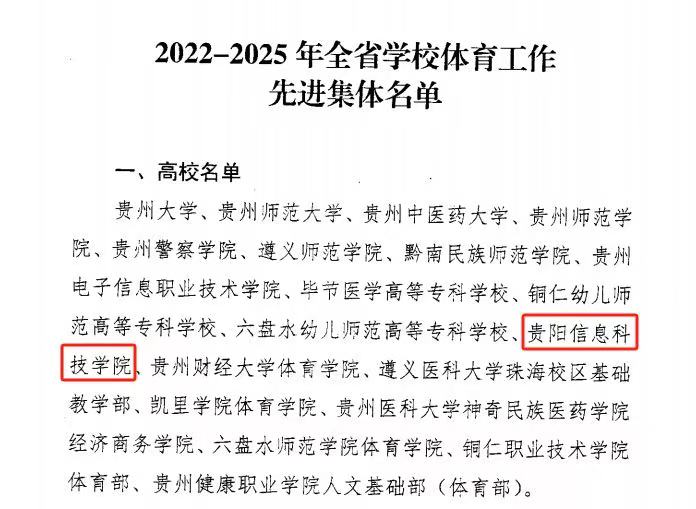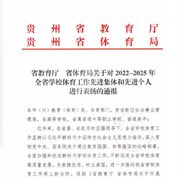 近日,贵州省教育厅、贵州省体育局联合下发《关于对2022—2025年全省学校体育工作先进集体和先进个人进行表扬的通报》(以下简称《通报》),对在全省学校体育工作中做出突出贡献的集体与个人予以通报表扬。pp电子公共教学部体育教研室凭借扎实的教学工作、优异的竞赛成绩和突出的育人成效,荣获“2022—2025年全省学校体育工作先进集体”称号,跻身全省57个受表彰的先进集体之列。