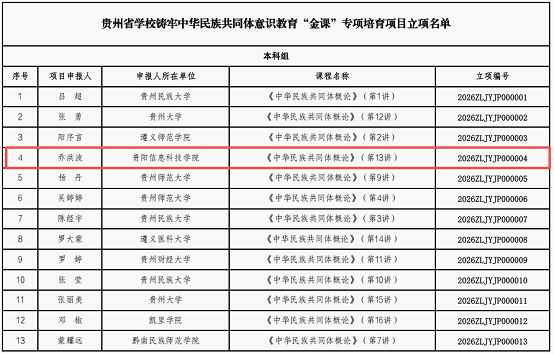 近日,省教育厅组织专家对各地各校申报的贵州省铸牢中华民族共同体意识教育 “金课” 专项培育项目进行评审,确定了拟立项名单。pp电子乔洪波教师团队成功立项。