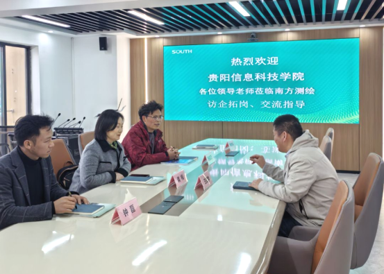 随后,教研室一行前往贵阳南方测绘科技有限公司。作为南方测绘集团在贵州的核心分支机构,业务覆盖测绘装备销售、地理信息软件研发、精准位置服务等多个领域,拥有完善的销售服务网络和专业的技术团队,其依托集团优势实现了多种测绘仪器的国产化推广。座谈中,企业负责人重点介绍了测绘行业前沿技术应用及人才需求标准,教研室老师结合地理信息科学专业课程设置,就如何提升学生实践操作能力、适配企业岗位需求与企业技术骨干进行深入交流,双方一致同意加强校企联动,推动课程内容与行业标准、企业需求精准对接。