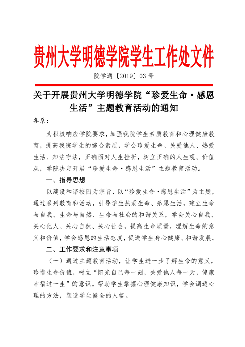 关于开展贵州大学明德学院“珍爱生命·感恩生活”主题教育活动的通知