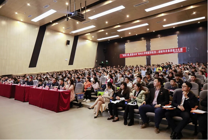 新闻网讯(学工部 邹佩君)为深入学习贯彻习近平新时代中国特色社会主义思想和党的十九大精神,全面贯彻落实全国高校思想政治工作会议和全国教育大会精神,加强学院辅导员队伍建设,3月28日18:30,由学生工作处主办的“凝聚力量,展望未来”辅导员素质能力提升工程——贵州大学明德学院第二届辅导员素质技能大赛决赛在图书馆报告厅举行。学院党委书记郭林桦、常务副院长罗卫东,副院长谢静,党委副书记金明辉,院长助理、学生工作处、招生就业处处长宿强,院长助理、财务处处长杨兵荣,院长助理、数字传媒系系主任康俊以及各系党总支书记作为评委出席比赛。学院全体辅导员和学生代表观摩了比赛。