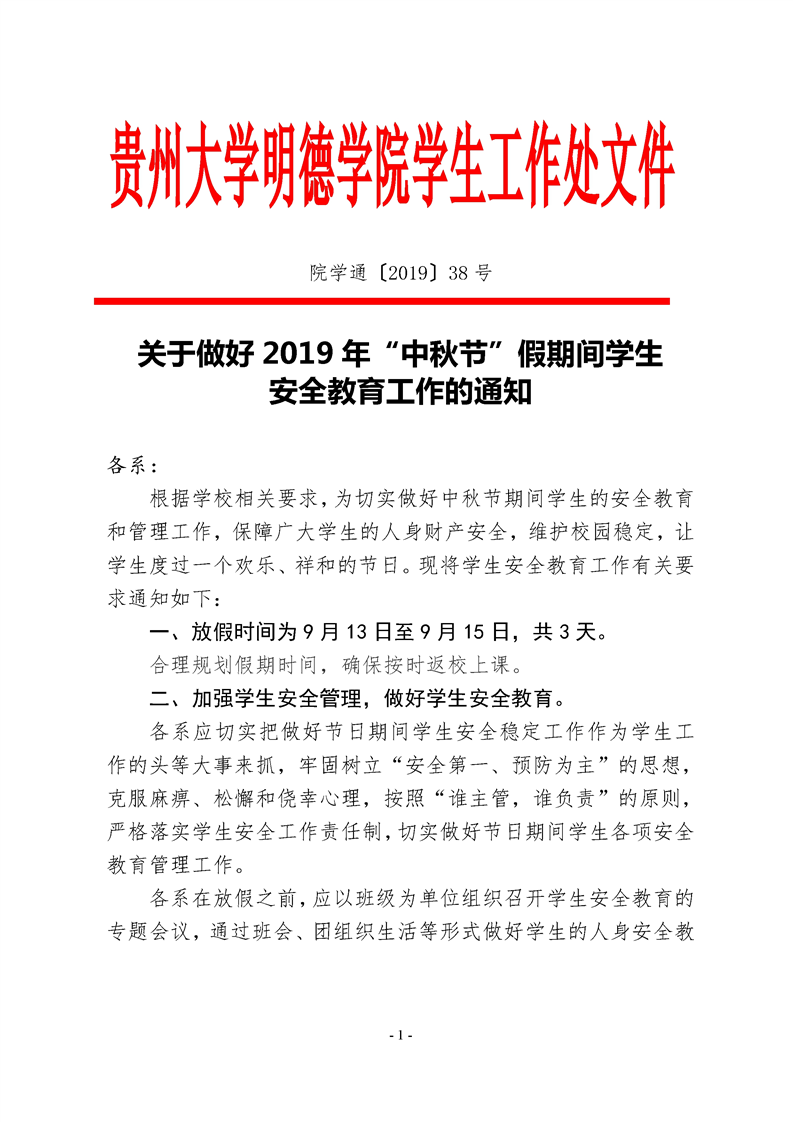 关于做好2019年“中秋节”假期间学生安全教育工作的通知