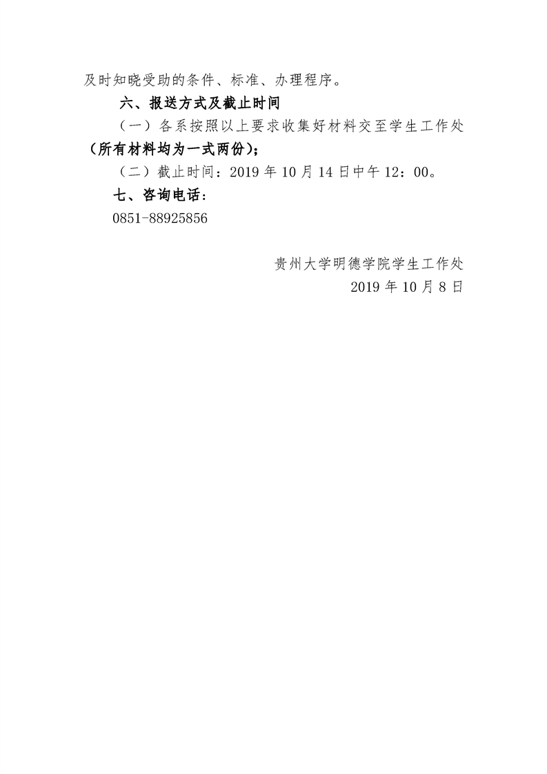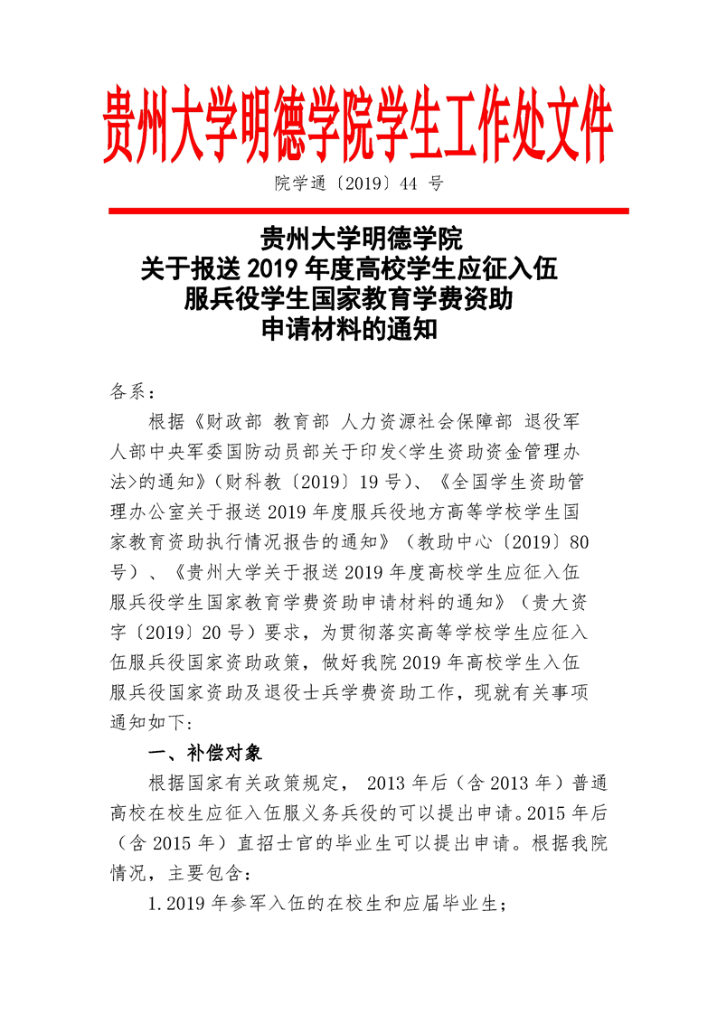 贵州大学明德学院关于报送2019年度高校学生应征入伍服兵役学生国家教育学费资助申请材料的通知