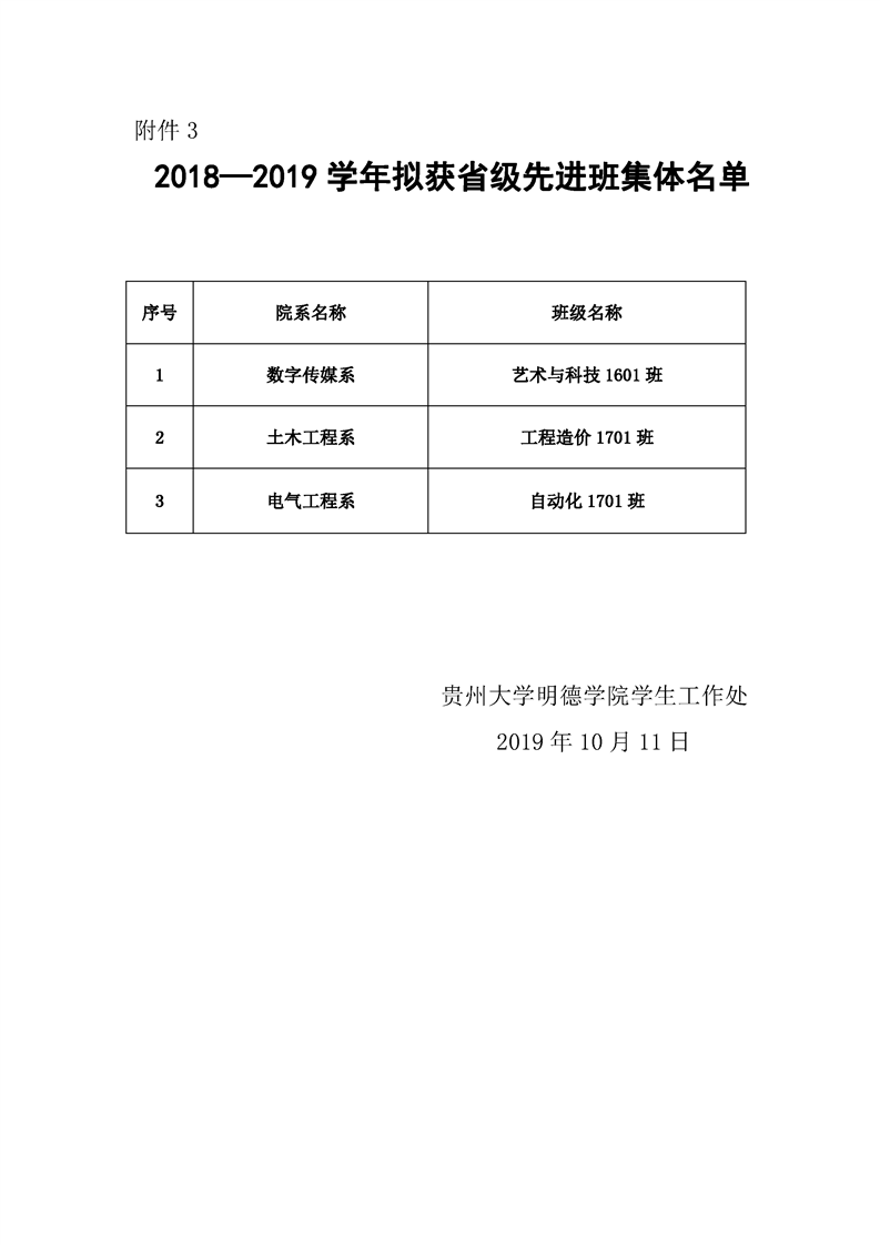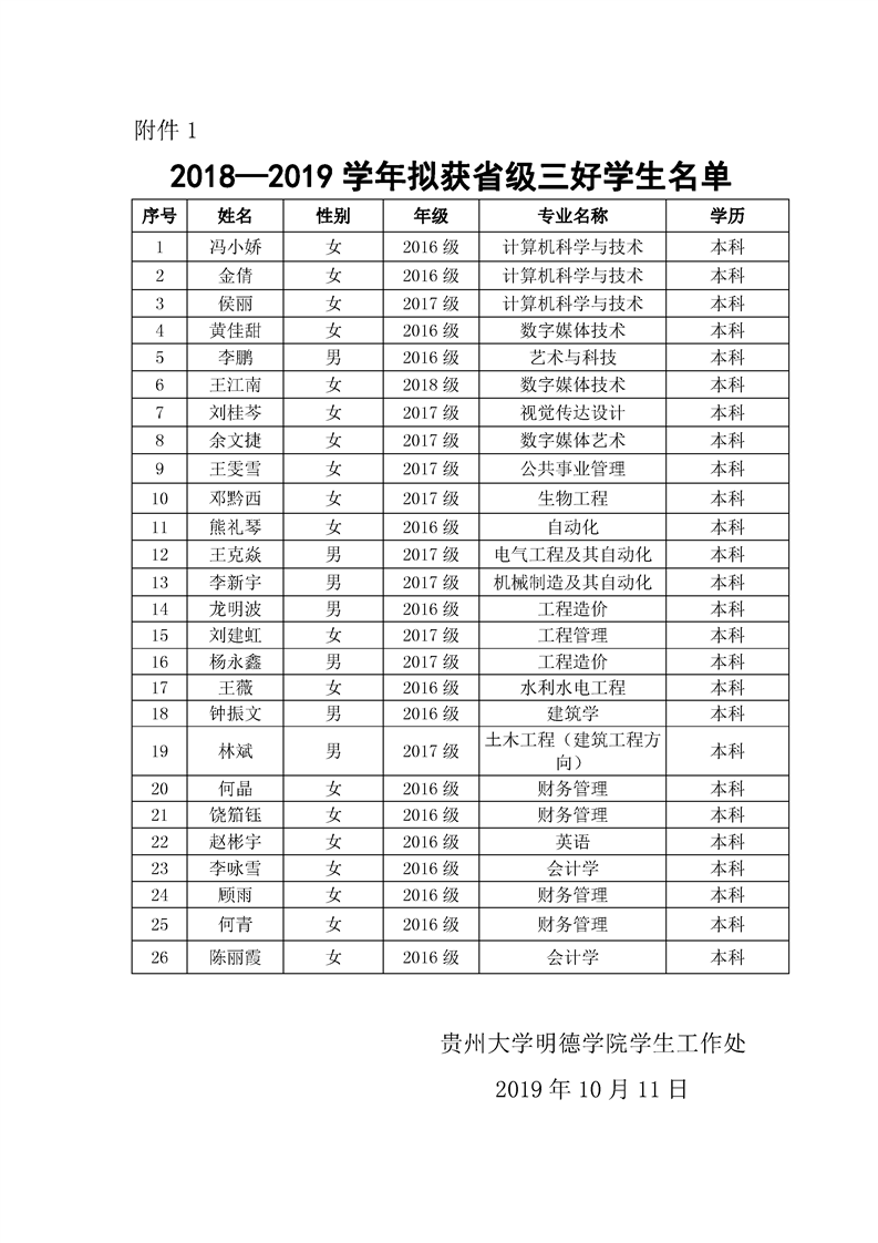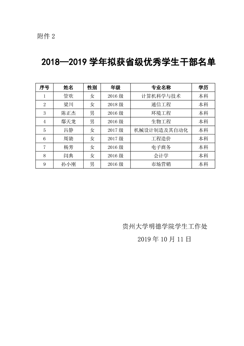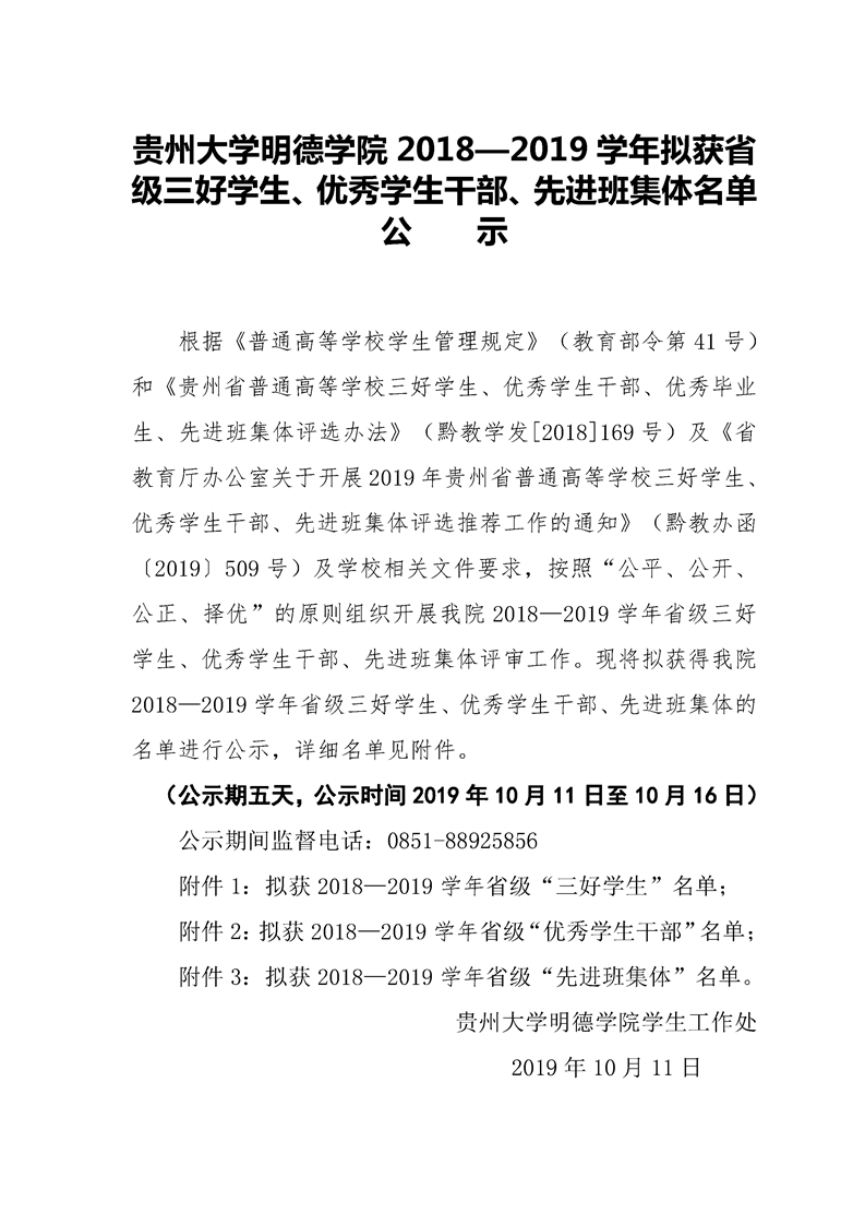 贵州大学明德学院2019年贵州省普通高等学校三好学生、优秀学生干部、先进班集体公示