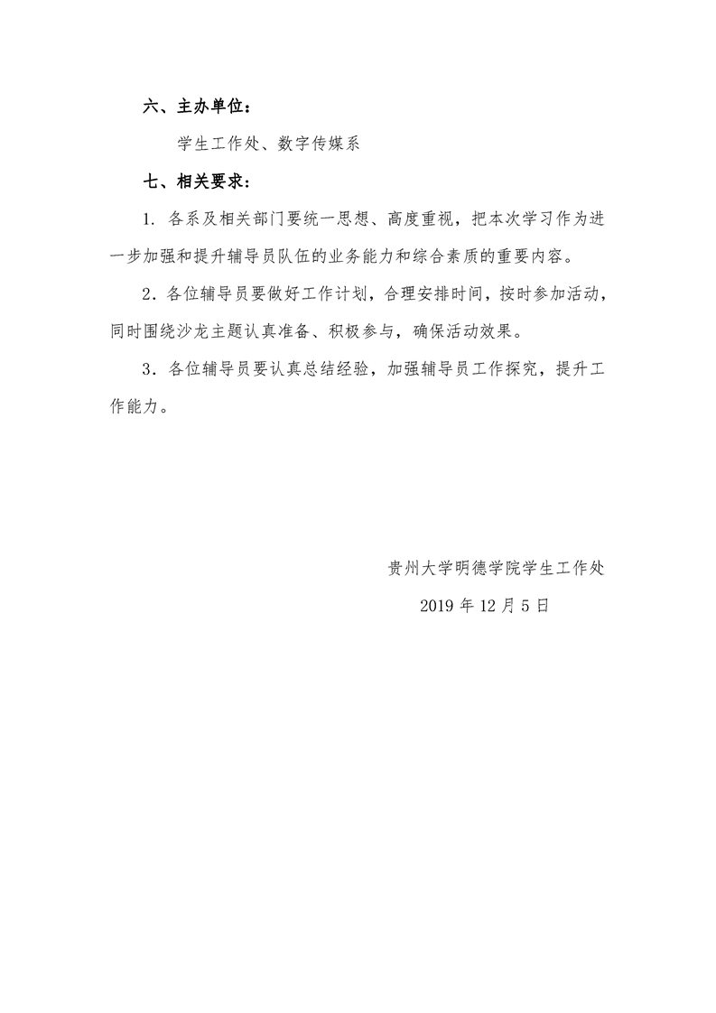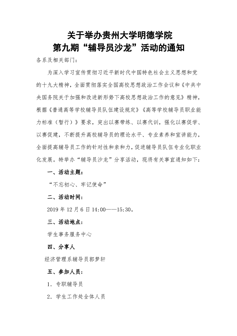 关于举办贵州大学明德学院第九期“辅导员沙龙”活动的通知