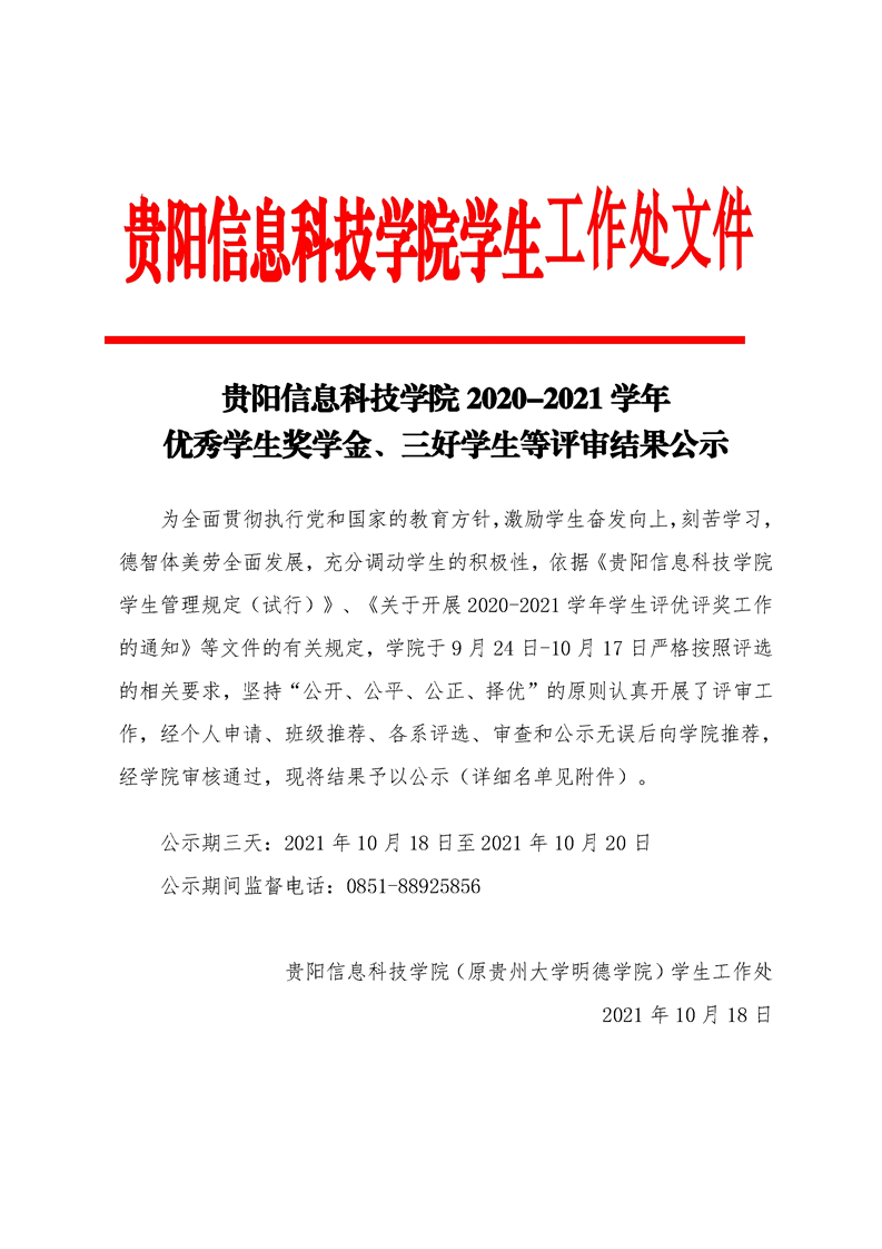 贵州大学明德学院关于对拟获2020-2021学年度国家励志奖学金人员的公示