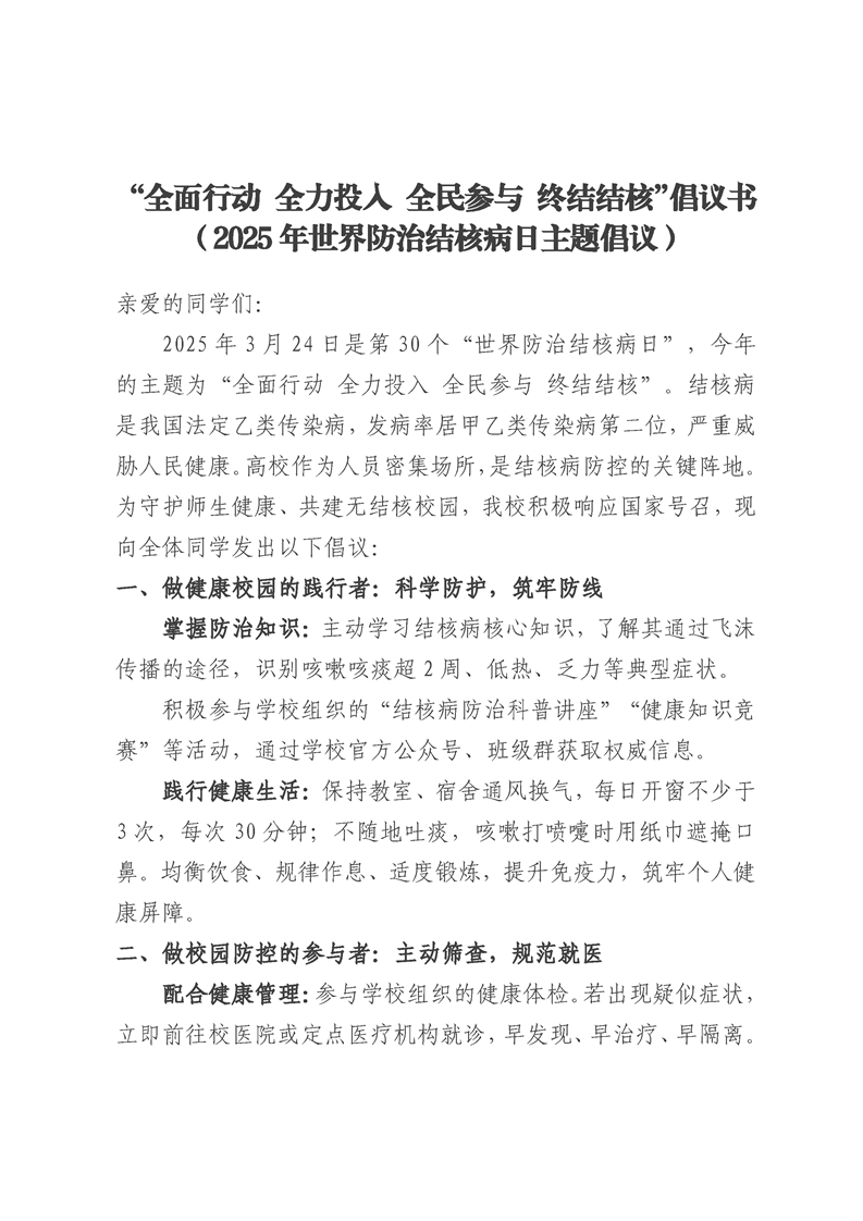“全面行动 全力投入 全民参与 终结结核”倡议书