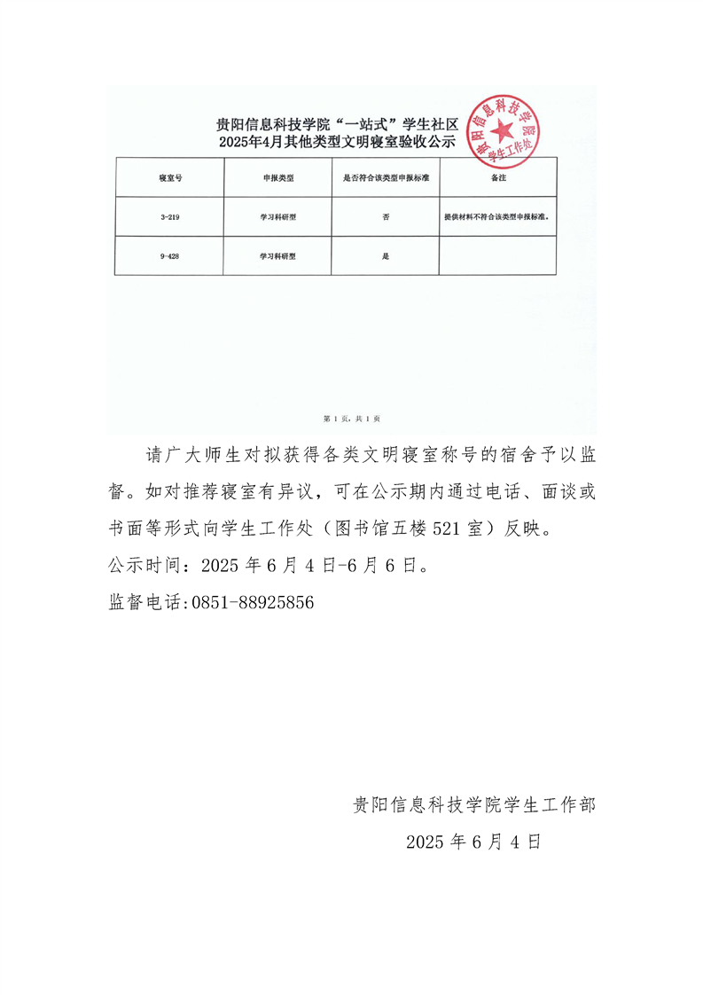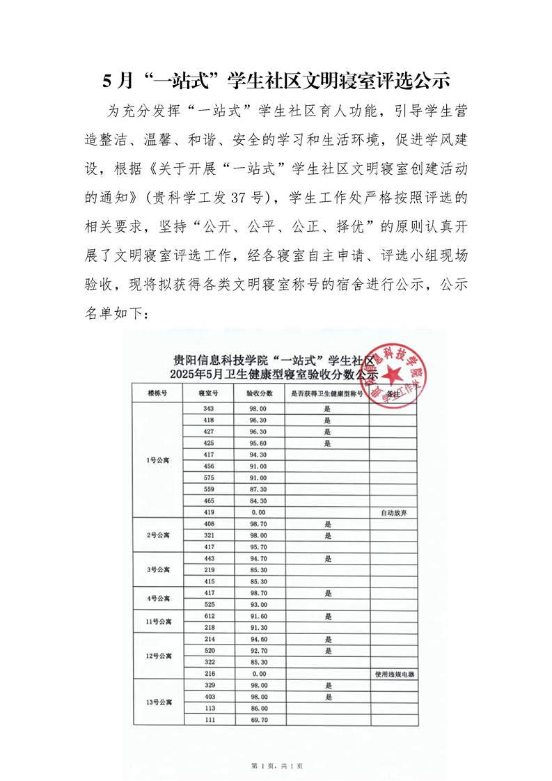 5月“一站式”学生社区文明寝室评选公示