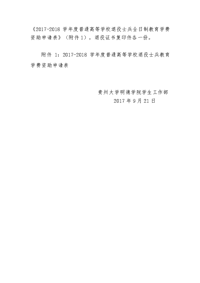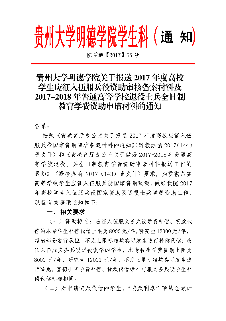 贵州大学明德学院关于报送2017年度高校学生应征入伍服兵役资助审核备案材料及2017-2018年普通高等学校退役士兵全日制教育学费资助申请材料的通知