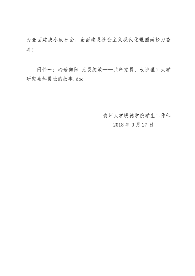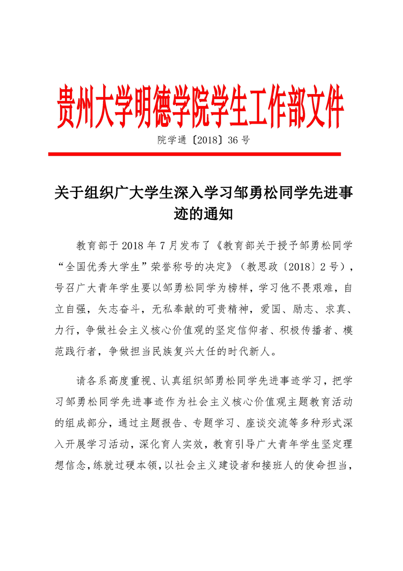 贵州大学明德学院关于组织学习邹勇松同学的先进事迹