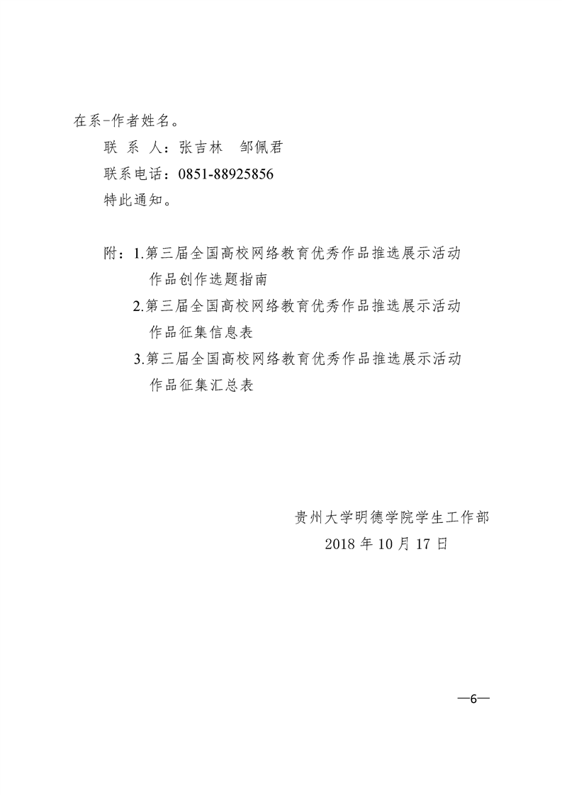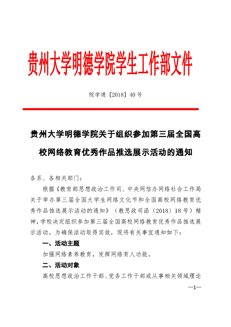贵州大学明德学院关于组织参加第三届全国高校网络教育优秀作品推选展示活动的通知
