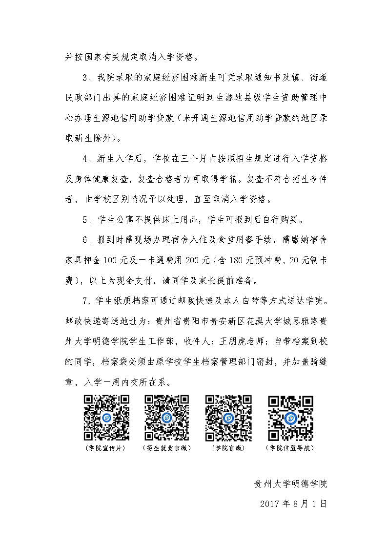 贵州大学明德学院2017级新生入学须知(统招本科及2016年预科升本)